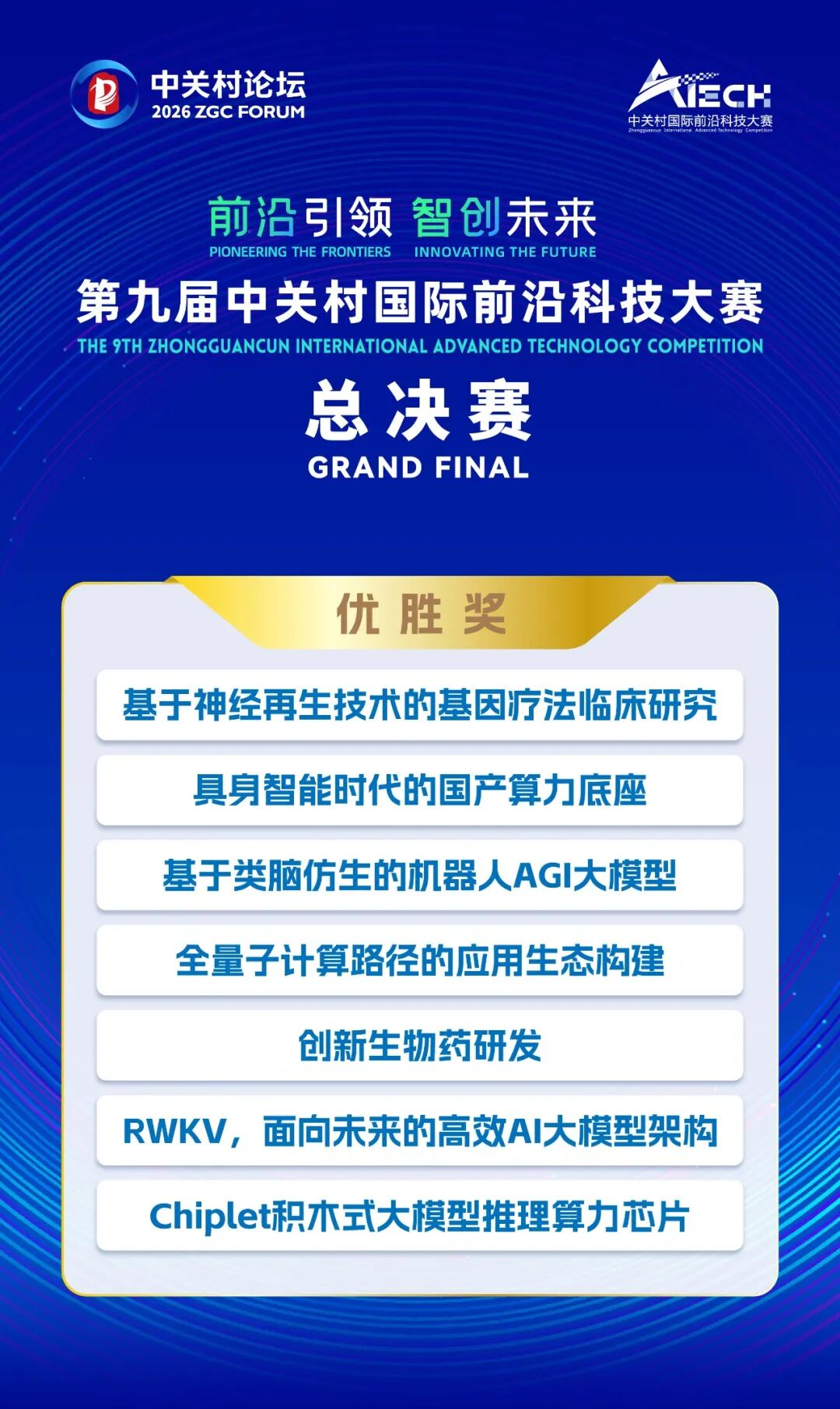 本届大赛以“前沿引领,智创未来”为主题,设置AI底层技术、AI应用、创新药、医疗器械、新材料、文化科技、金融科技7个领域,汇聚境内外2100余个前沿技术项目,覆盖全球68个国家和地区,国际项目占比43%,人工智能项目占比约40%。经过初赛、复赛、半决赛,共有10个项目晋级总决赛,最终产生冠亚季军和7个优胜奖项目。