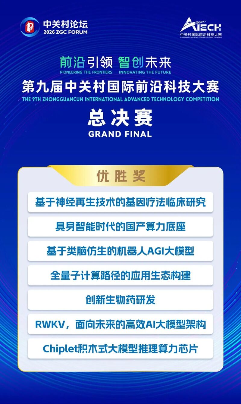 3月26日,2026中关村论坛年会——第九届中关村国际前沿科技大赛总决赛在中关村国际技术交易中心举办。经过现场路演和专家评委即时打分,本届大赛冠军、亚军和季军产生,分别是以灵巧手和云端智能为核心的具身智能平台、基于框架核酸的miRNA智能递送系统研发及在无创渗透给药的技术探索、实时三维态势感知移动式空间智能交互解决方案及世界大模型。
