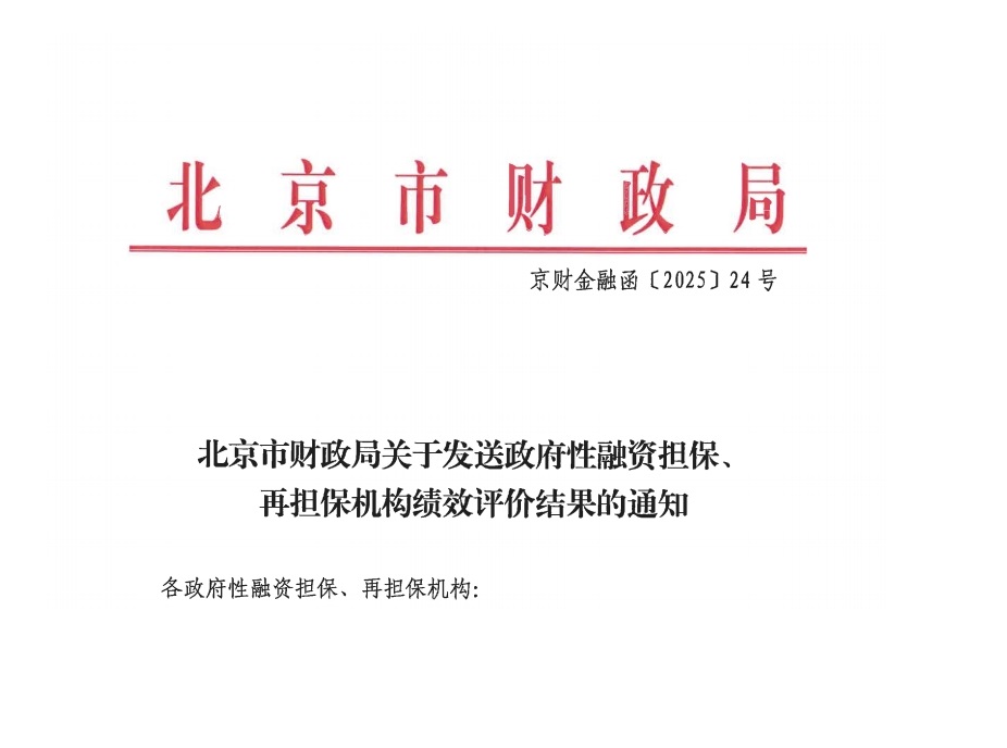 本次绩效评价系《北京市政府性融资担保、再担保机构绩效评价办法(试行)》由北京市财政局组织开展,覆盖北京市19家政府性融资担保、再担保机构,评价指标涉及四大类、十七项,全面、综合评价机构政策性功能作用的发挥情况,综合考虑绩效评价得分和排名,确定优、良、中、差的评价结果,作为政府部门对政府性融资担保、再担保机构提供资本金补充、代偿补偿、奖励补贴等配套支持政策的重要参考依据。