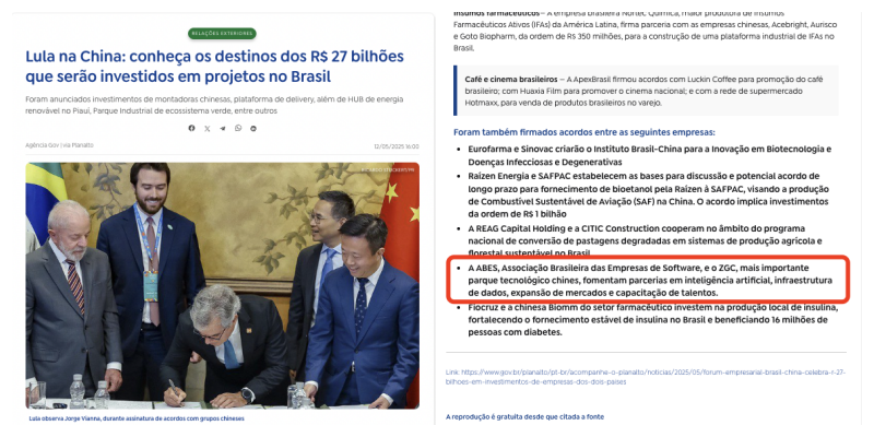 近日,巴西总统卢拉访华期间出席中国-巴西商业研讨会。研讨会上,中关村发展集团旗下中关村国际与巴西软件企业协会(ABES)签署了战略合作协议。