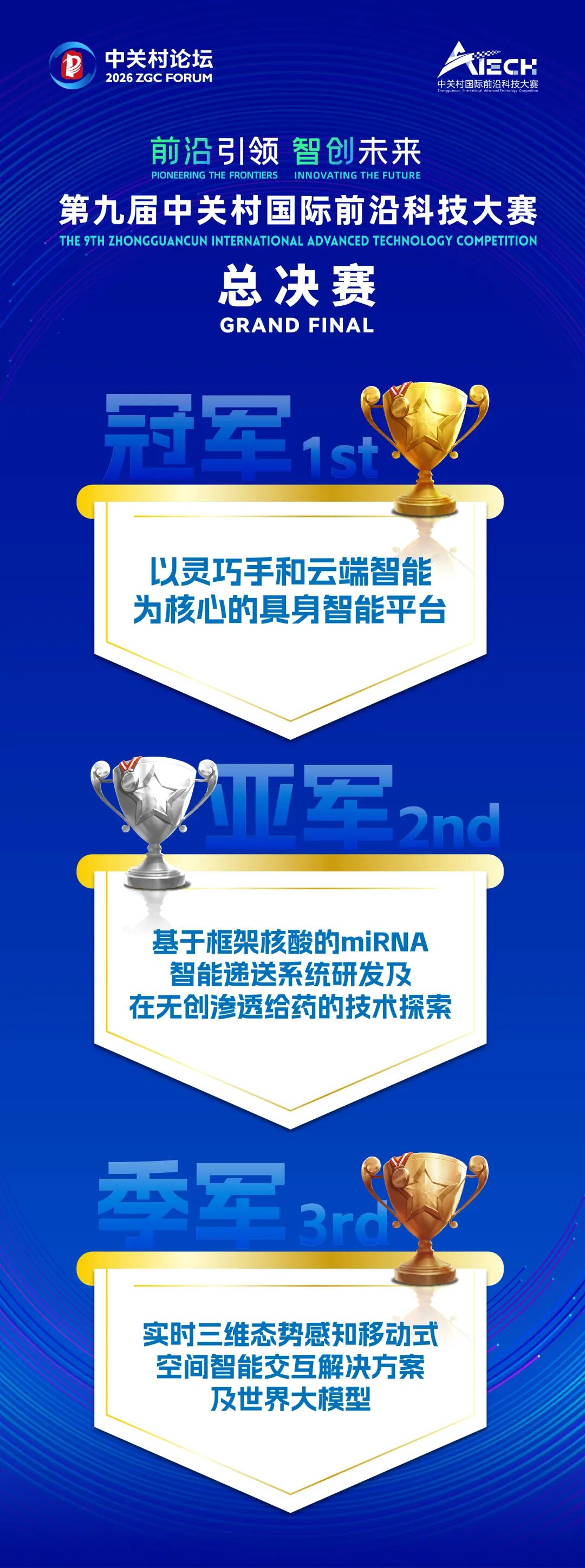 3月26日,2026中关村论坛年会——第九届中关村国际前沿科技大赛总决赛在中关村国际技术交易中心举办。经过现场路演和专家评委即时打分,本届大赛冠军、亚军和季军产生,分别是以灵巧手和云端智能为核心的具身智能平台、基于框架核酸的miRNA智能递送系统研发及在无创渗透给药的技术探索、实时三维态势感知移动式空间智能交互解决方案及世界大模型。